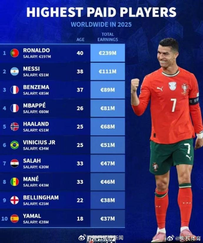 [#C罗成2025欧宝足球#]#C罗成239 Million Euros Thu nhập hàng đầu Bóng đá#Hôm nay, thị trường chuyển nhượng ở Đức tính thu nhập của các cầu thủ vào năm 2025. Cristiano Ronaldo đứng đầu danh sách với thu nhập đáng kinh ngạc 239 triệu euro, trở thành vị vua giàu nhất bóng đá hàng năm.