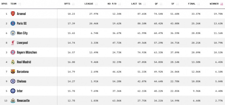 Ngày 21 tháng 10, vòng 3 UEFA Champions League sắp bắt đầu. Siêu máy tính opta cập nhật xác suất vô địch Champions League. Arsenal đứng thứ nhất, Paris và Manchester City xếp thứ hai và thứ ba.