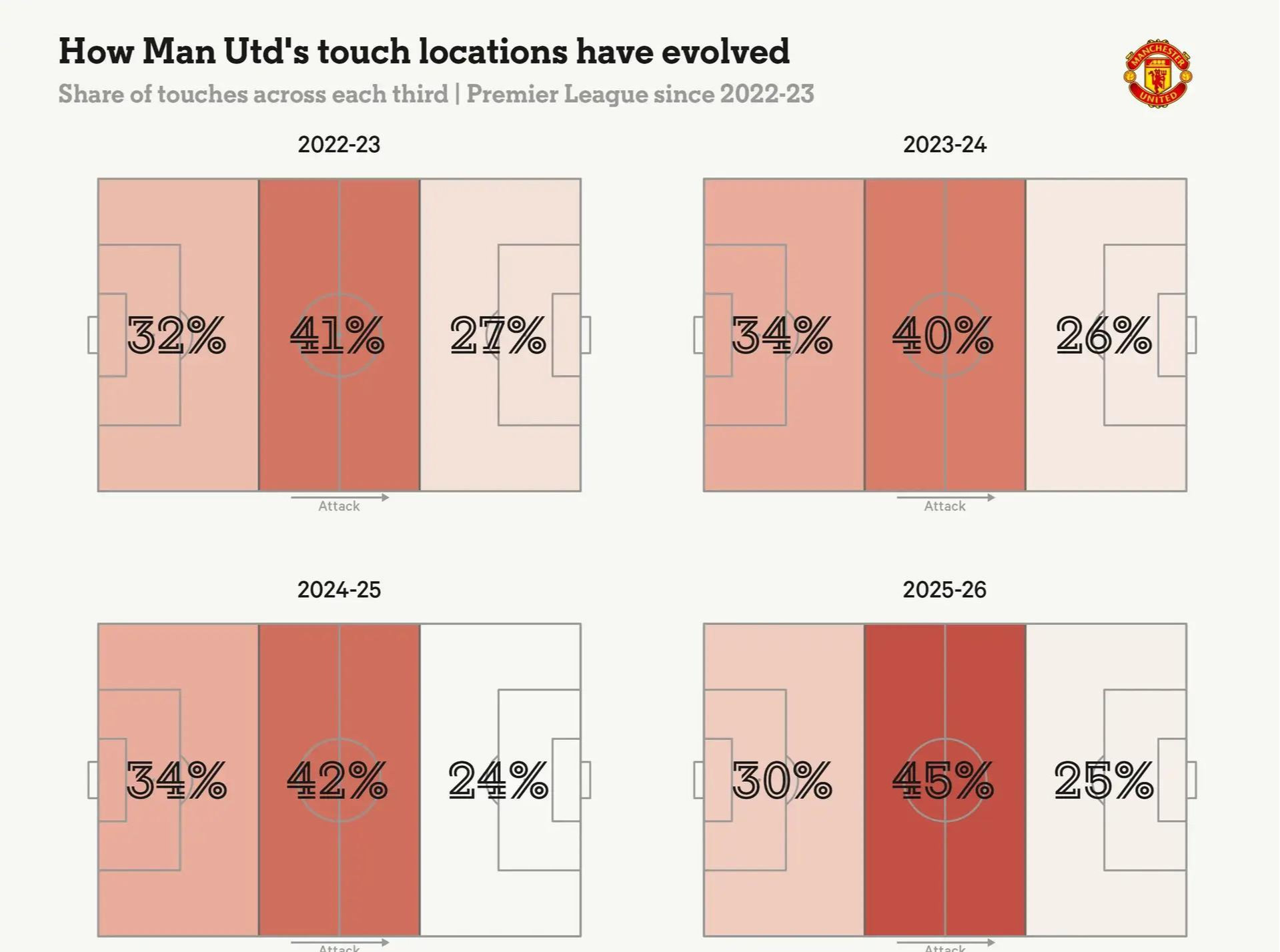 Sự thay đổi đáng kể nhất được phản ánh trong cách tổ chức tấn công của Manchester United. Việc bổ sung thủ môn mới Ramens đã mang lại những thay đổi mang tính cách mạng. Số đường chuyền dài trung bình mỗi trận của anh dẫn đầu giải đấu, giúp Quỷ đỏ tránh được nguy cơ lây lan từ đường ngược chiều. Tần suất chuyền dài của đội mùa này đã tăng gần gấp đôi so với mùa giải trước, khiến họ trở thành đội có lối chơi trực tiếp tốt nhất Premier League. Nó không chỉ đẩy nhanh nhịp độ tấn công mà còn hạn chế hiệu quả tình trạng mất quyền cầm bóng ở phía trước vòng cấm.