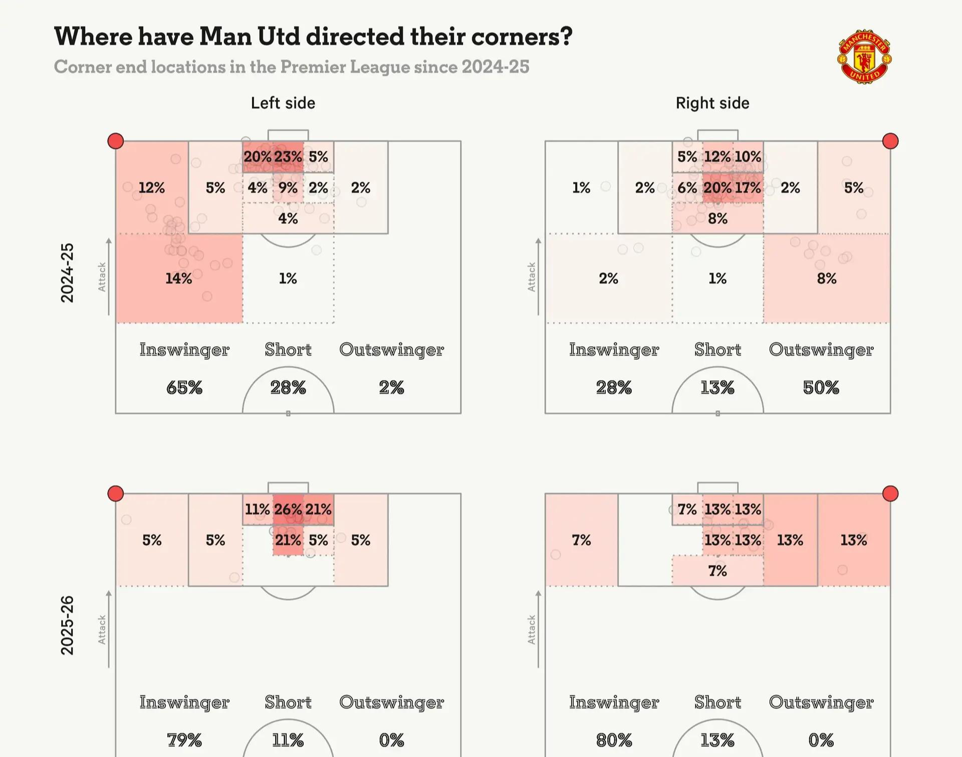 Một thay đổi khác đã âm thầm diễn ra là chiến thuật đá phạt góc. Với việc Mbemo và Bruno Fernandez cùng thực hiện quả phạt đền, United đã áp dụng những đường tạt bóng xuyên suốt và ghi được ba bàn thắng từ các tình huống cố định mùa này. Nhưng vẫn còn những mối nguy hiểm tiềm ẩn ở hàng phòng ngự - Quỷ đỏ hiện đang ghi trung bình 0,53 bàn thắng dự kiến từ những quả phạt đền mỗi trận, xếp cuối cùng trong giải đấu.