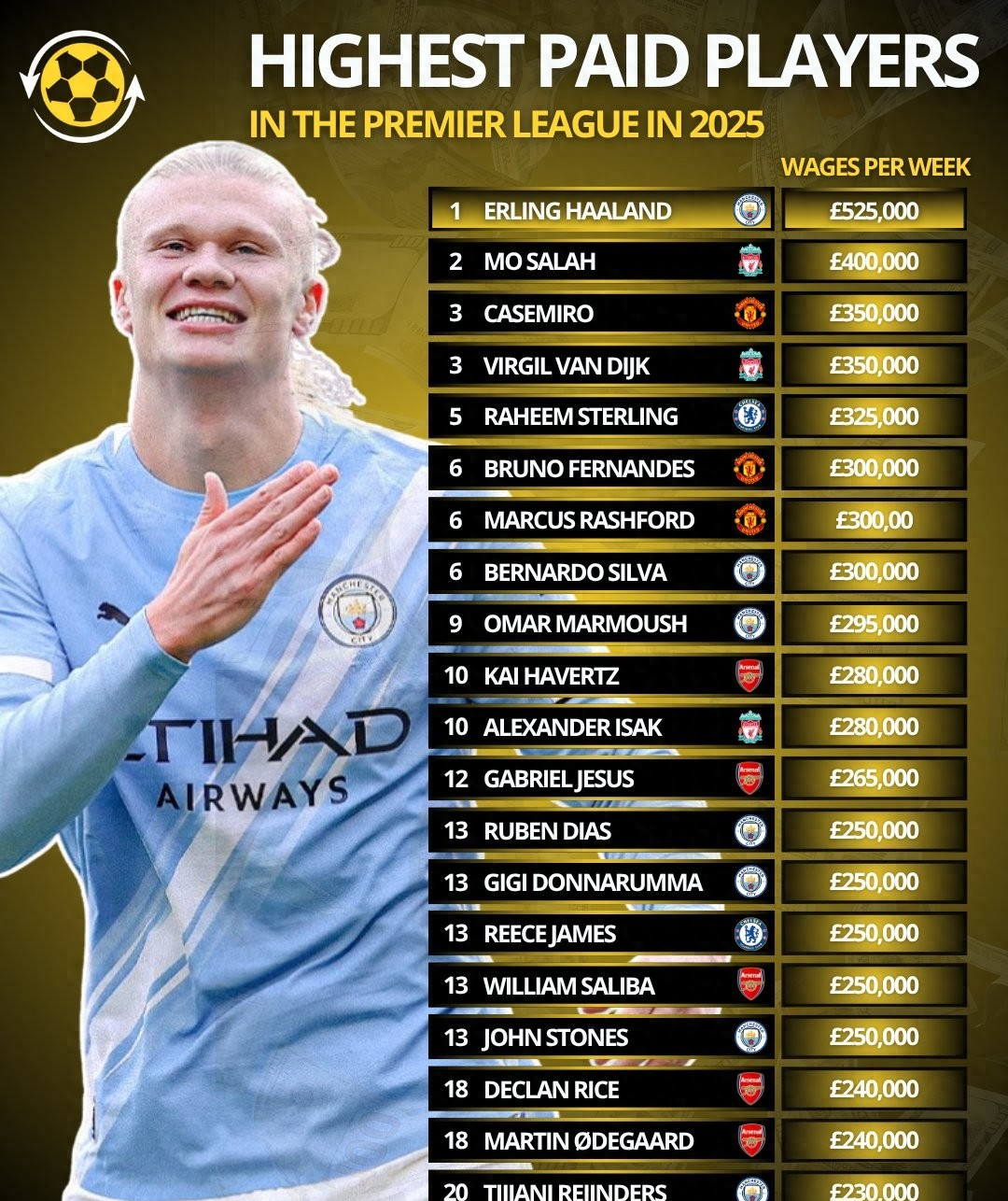 tại đây Trong danh sách lương mới nhất của Premier League, Haaland chắc chắn là cầu thủ được trả lương cao nhất ở Premier League, với mức lương hàng tuần lên tới 525.000 bảng (tương đương 4,90787 triệu nhân dân tệ), và tiền đạo người Na Uy cũng là cầu thủ duy nhất ở Premier League có mức lương hàng tuần vượt quá 400.000 bảng. Xếp sau anh, những cầu thủ như Salah và Casemiro có mức thu nhập lần lượt là 400.000 và 350.000.