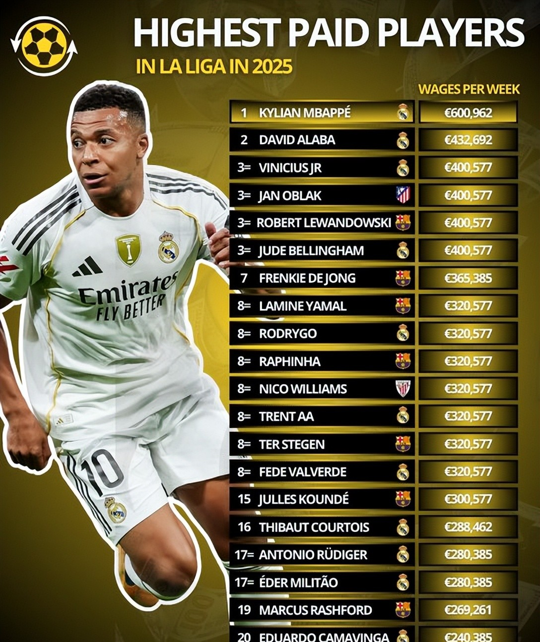Rất giống với tình hình ở Premier League, mức lương ở La Liga cũng có thể nói là tình hình một người có thể nổi bật và nhiều người mọi người có thể gặp nhau với giá 300.000. Điểm giống nhau giữa cả hai là 20 cầu thủ dẫn đầu bảng lương đều do các CLB giàu có độc quyền. Tuy nhiên, không giống như Premier League có 5 đội, La Liga gần như bị Real Madrid thống trị - ngoại trừ Oblak của Atletico Madrid và Nico Williams của Bilbao có thể lọt vào danh sách, 18 cầu thủ còn lại đều do các cầu thủ đến từ Real Madrid, 11 từ Real Madrid, 26% từ Barcelona và 7 từ Barcelona.
