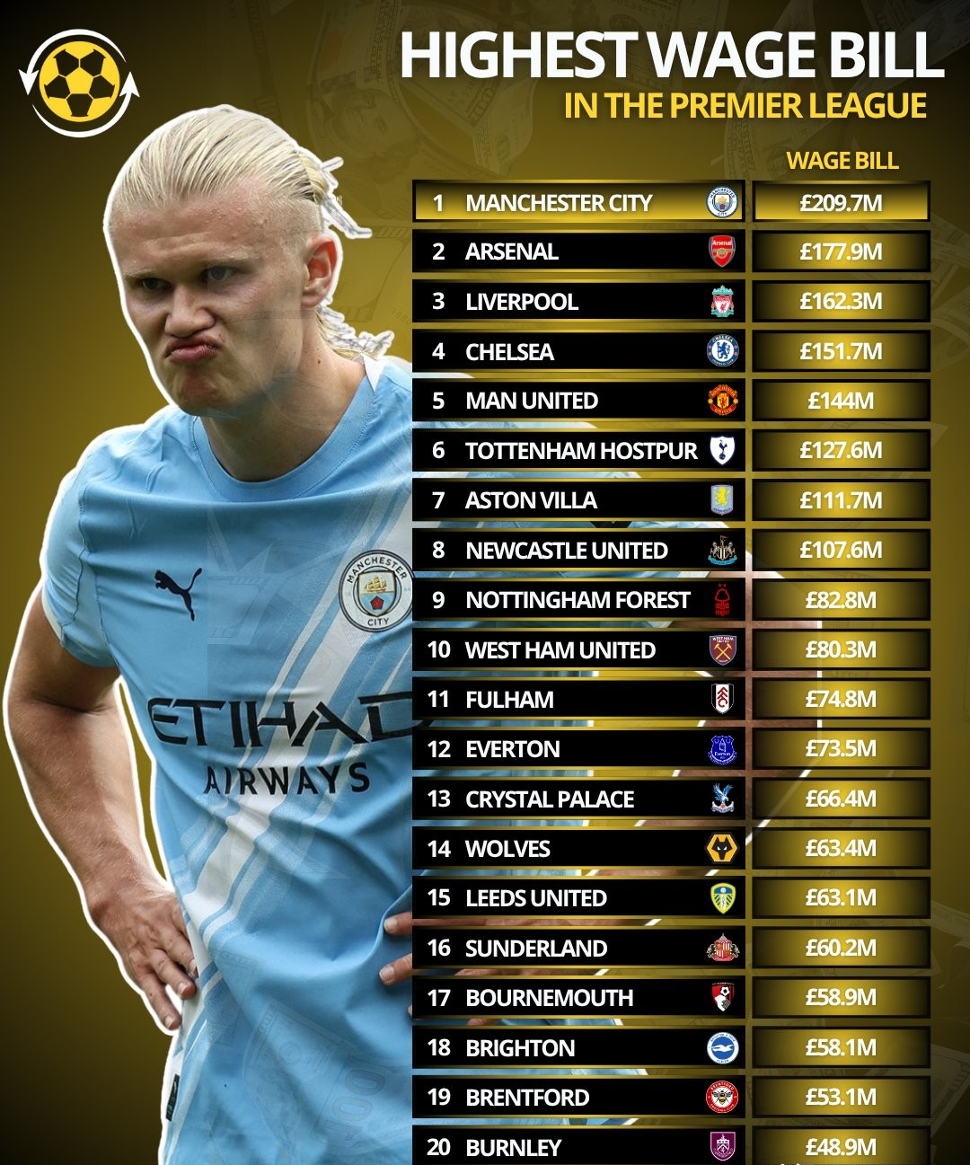 Khi công bố tổng hóa đơn mùa giải của 20 đội ở Premier League, chúng ta chắc chắn có thể thấy "rãnh" của Premier League - có tới 8 đội trong giải đấu có hóa đơn lương vượt quá 100 triệu bảng, điều này cũng khiến Premier League dường như đang đốt tiền.