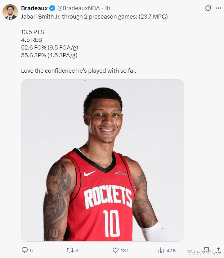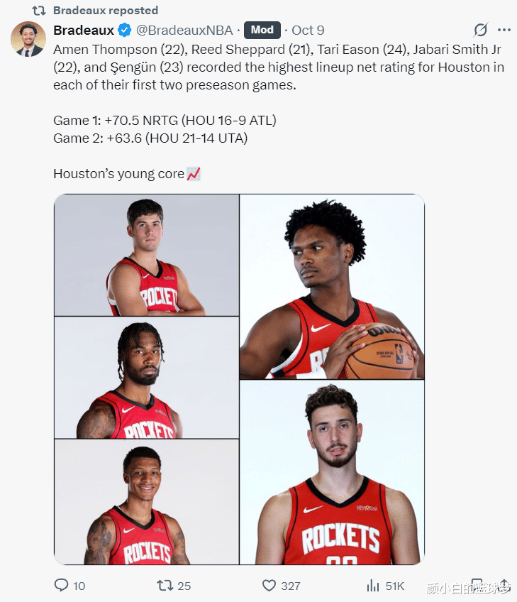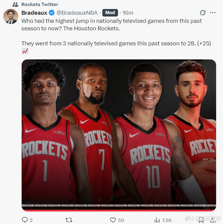 Vào ngày 12 tháng 10, Fire Journal Bradeaux đã viết: Bạn có biết ai là người thực hiện cú nhảy chính xác nhất trong một trận đấu được truyền hình toàn quốc không? Đó là Houston Rockets. Liên đoàn cũng tăng số trận phát sóng toàn quốc từ 3 trận lên 28 trận.