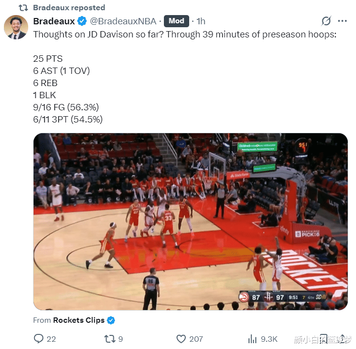 Davidson, một cầu thủ có hợp đồng hai chiều, đã chơi tổng cộng 39 phút trong hai trận, sút 9 trên 16, 6 trong 11 quả ba điểm, 25 điểm, 6 hỗ trợ, 6 rebound, 1 block và chỉ có 1 lần chuyển bóng. Tỷ lệ bắn của anh ấy là 56,3% và tỷ lệ bắn ba điểm của anh ấy là 54,5%. Sự xuất hiện của anh cũng là điểm mấu chốt để Rockets cải thiện khả năng bắn súng của mình. Vì KD mạnh quá nên tôi không nhắc tới nên chắc chắn là chính xác.