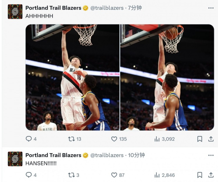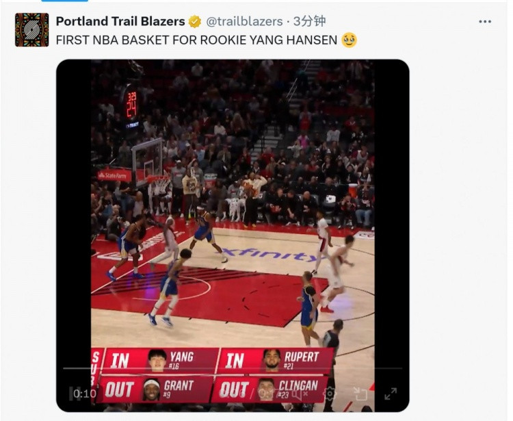 Bàn thắng trong trận đấu thể thao đầu tiên trong sự nghiệp NBA! Twitter chính thức của Trail Blazers đăng ba bản cập nhật Yang Hansen liên tiếp