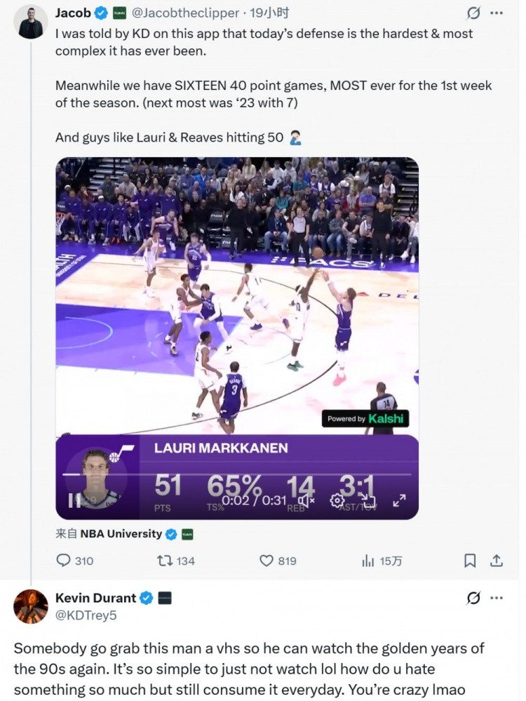 Cư dân mạng: "KD nói với tôi trên ứng dụng này rằng hàng phòng ngự NBA ngày nay mạnh nhất và phức tạp nhất trong lịch sử. Đồng thời, chúng tôi đã có 16 trận ghi được hơn 40 điểm, đây là kỷ lục cao nhất trong tuần đầu tiên của một mùa giải trong lịch sử. (Kỷ lục cao thứ hai là 7 trận vào năm 2023) Ngoài ra còn có những cầu thủ như Markkanen và Reaves, số điểm lên tới 50♂"