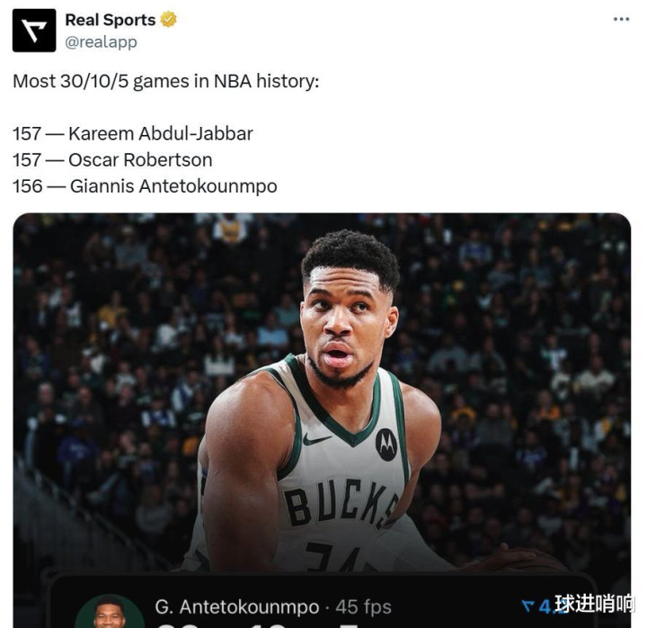 Với thành tích này, Antetokounmpo đã ghi ít nhất 30 điểm, 10 rebound và 5 kiến tạo trong một trận đấu lần thứ 156 trong sự nghiệp, đứng thứ hai trong lịch sử NBA, chỉ đứng sau Kareem Abdul-Jabbar và Big O, những người đồng hạng nhất 157 lần.